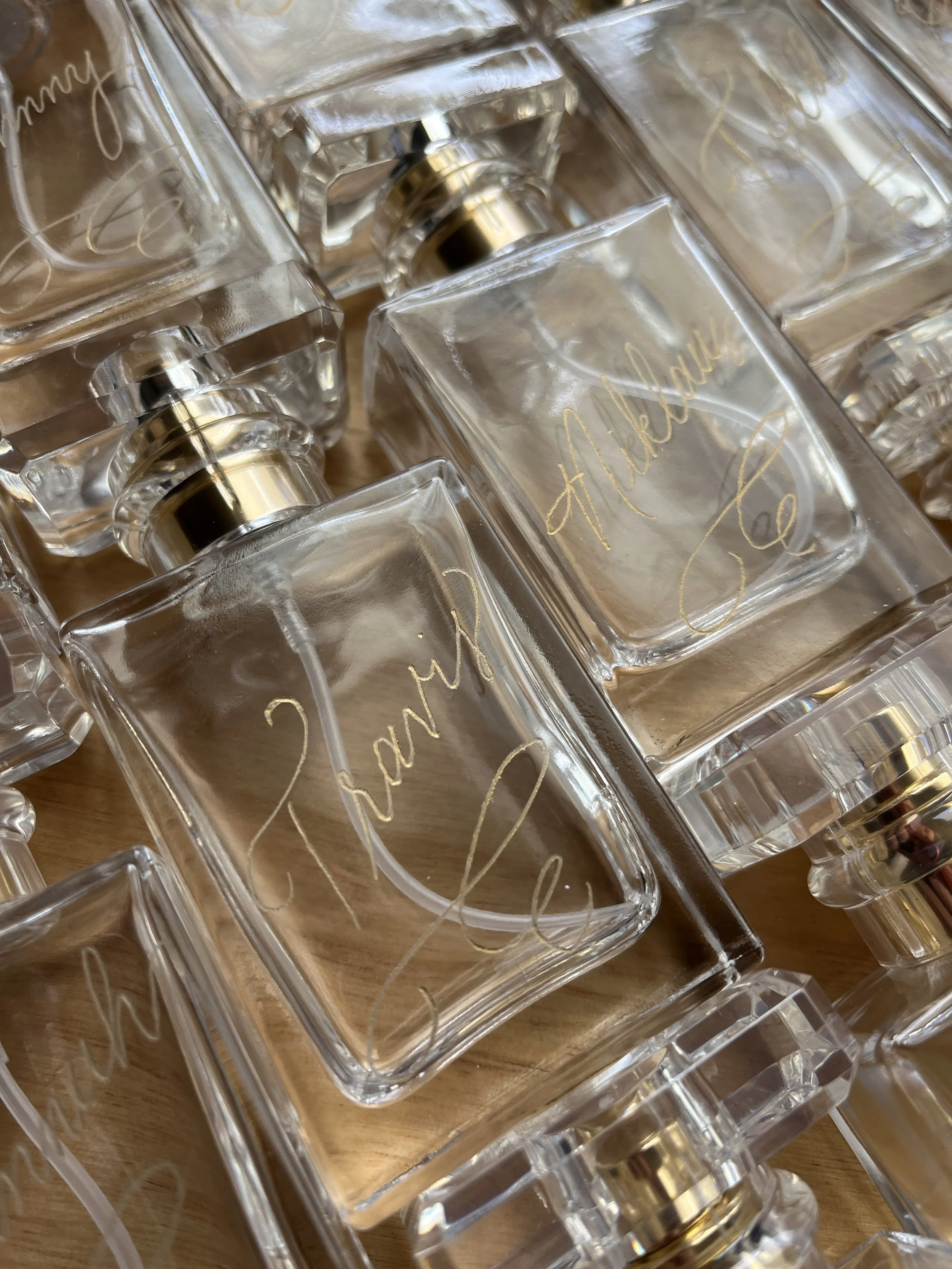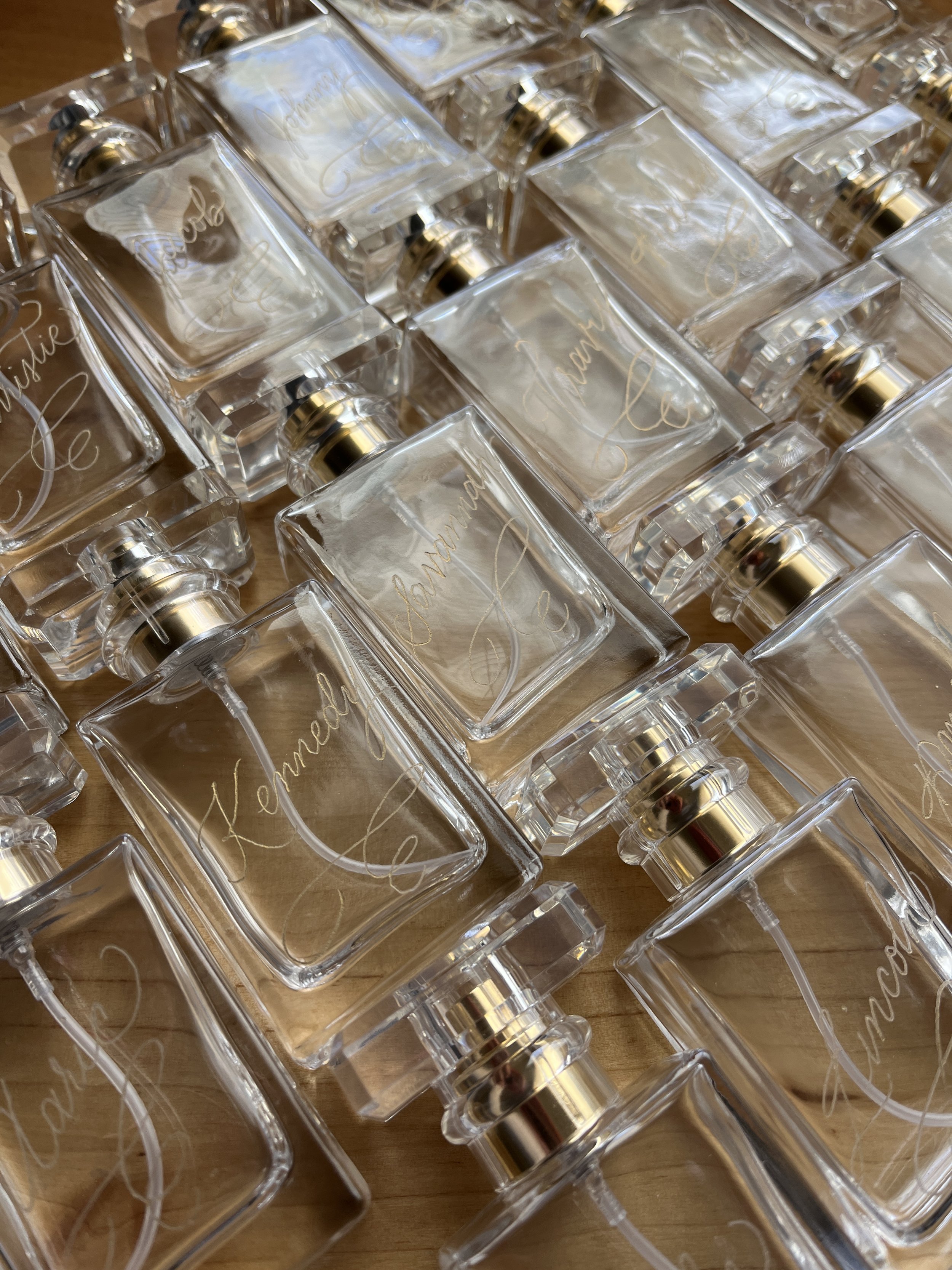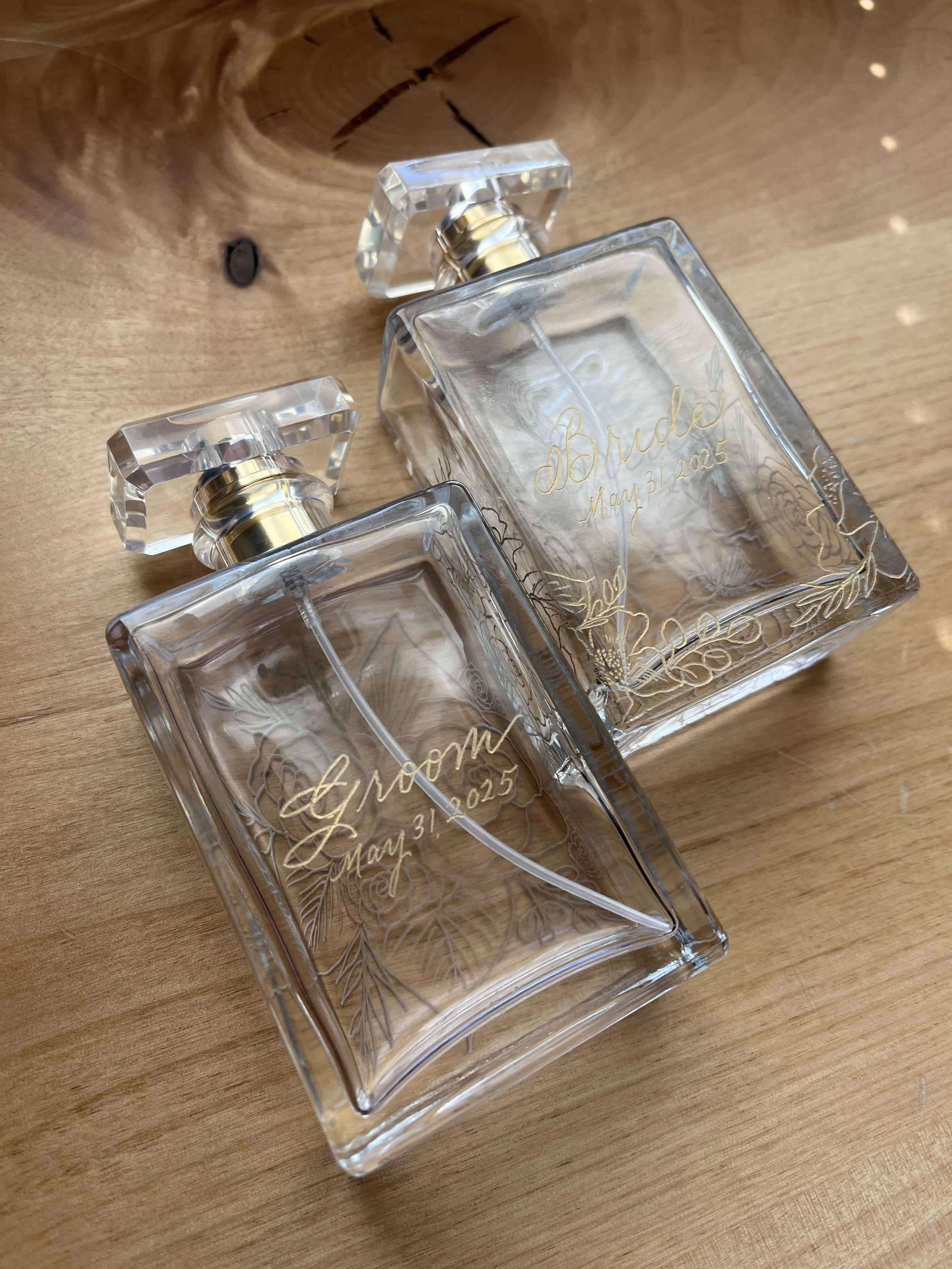 The magic begins when you decide you want something truly special—a personalized gift for your bridesmaids, a keepsake for the mother of the bride, or a unique way to commemorate your wedding day. You purchase the engraving service, and I send you my shipping address. From there, you can ship your perfume bottles directly to me from your favorite online retailer, or send bottles you already own. Empty bottles work just as well—the engraving is what transforms them into something extraordinary.
