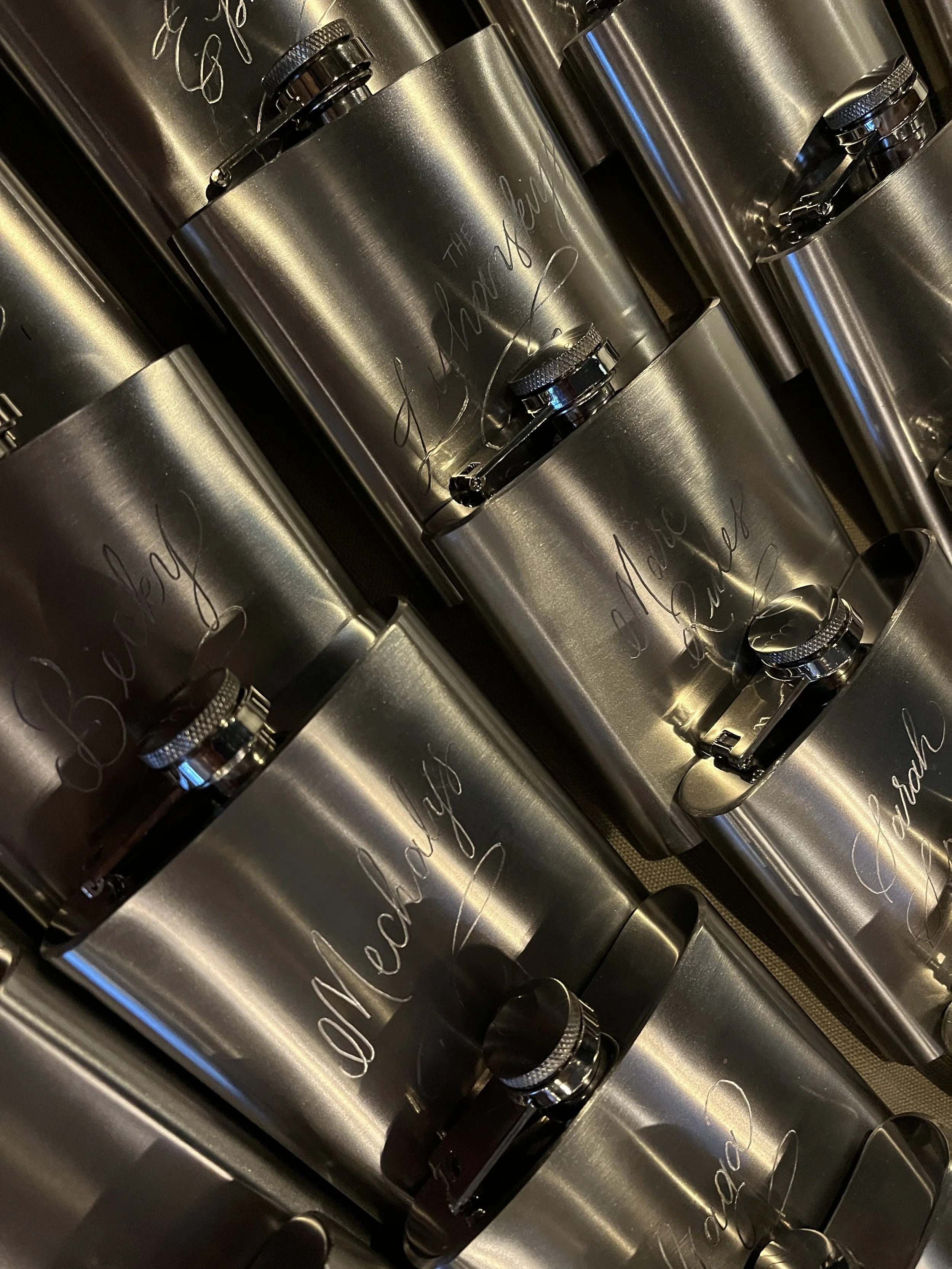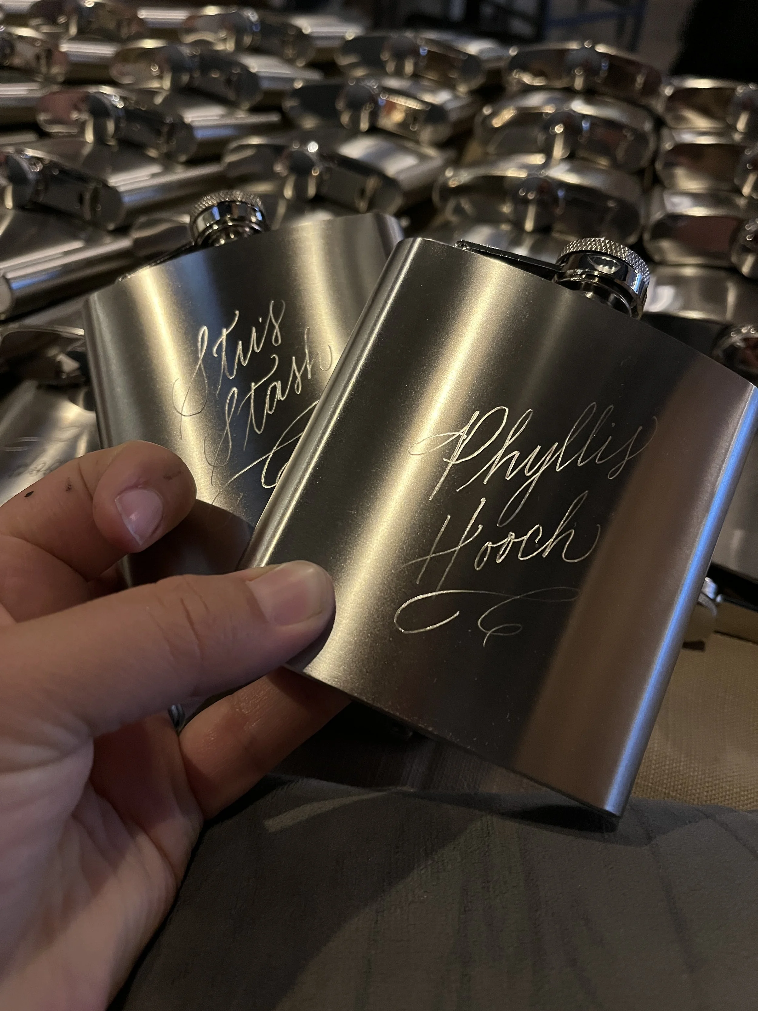 Creating 250 individually engraved flasks requires meticulous organization and execution. Each flask needed: