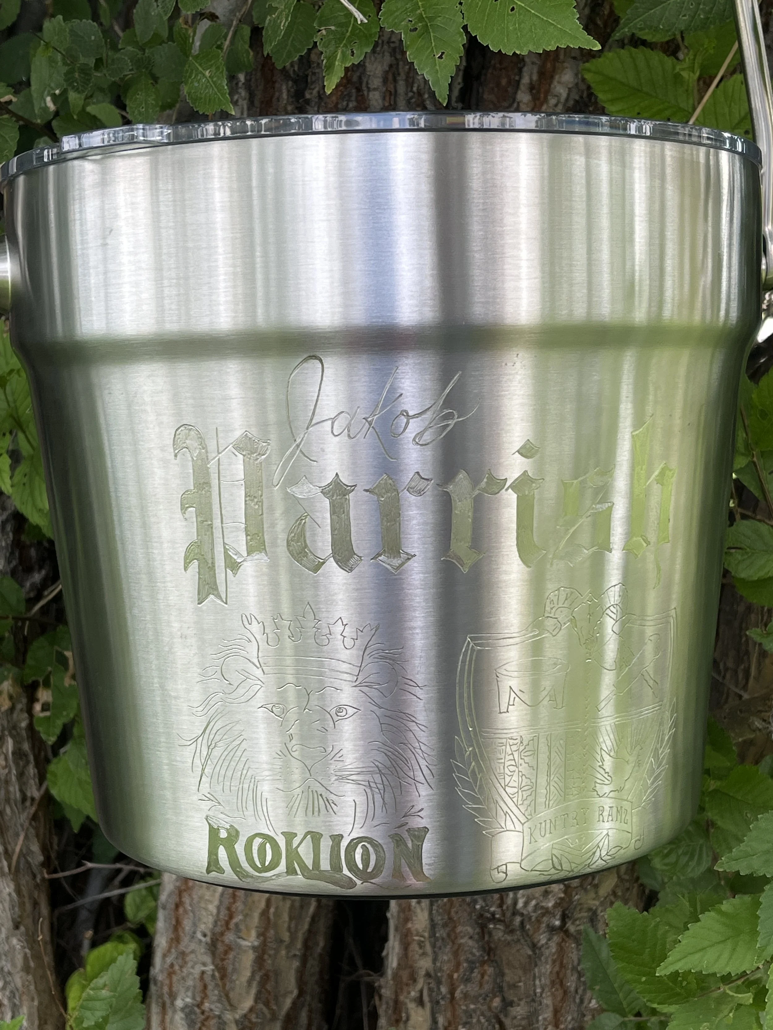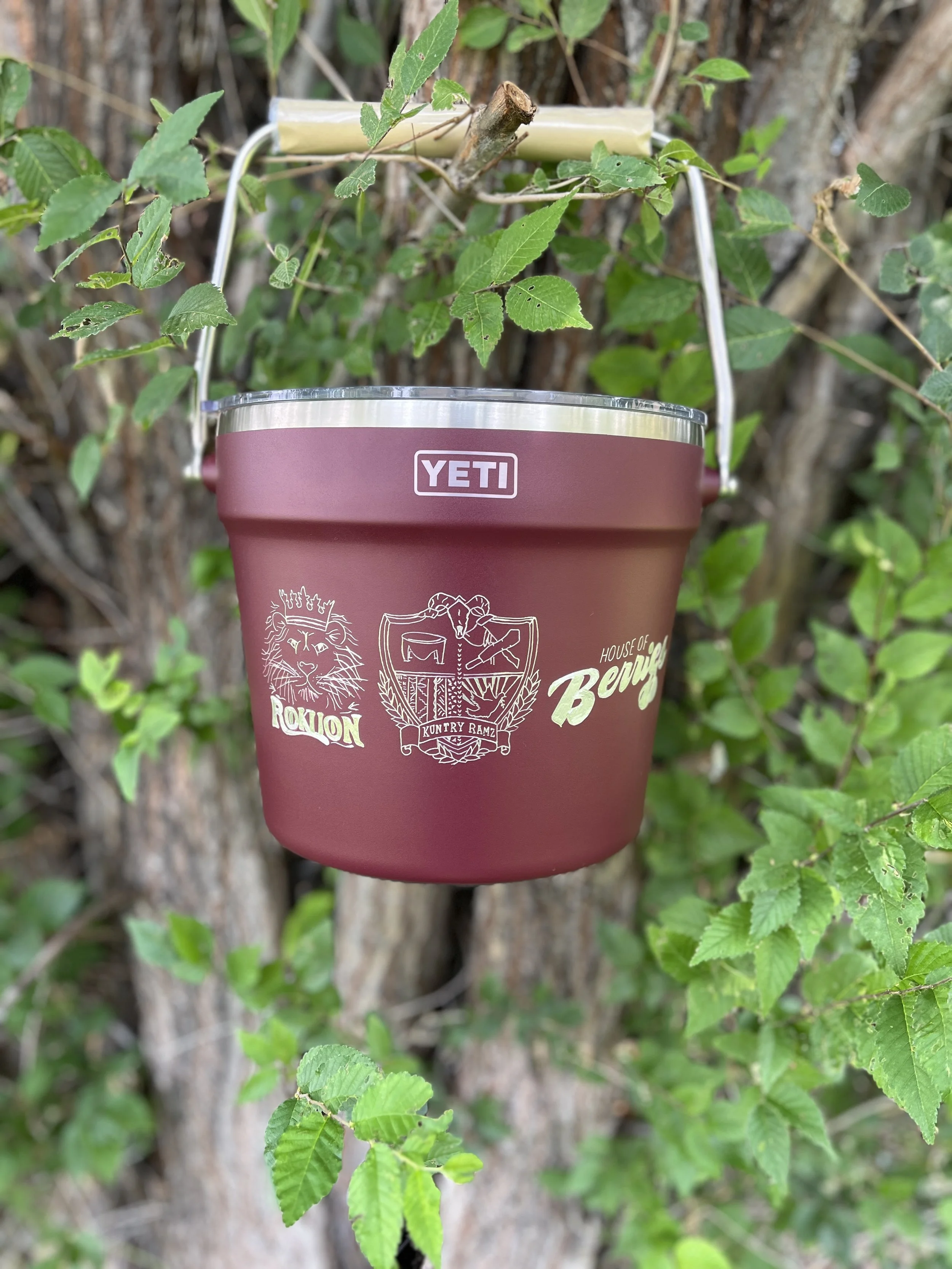 Engraving on YETI's powder-coated surfaces creates permanent personalization that won't fade, peel, or wear off. Each bucket was carefully engraved with personal names alongside detailed designs, creating fully customized pieces that reflect individual style.