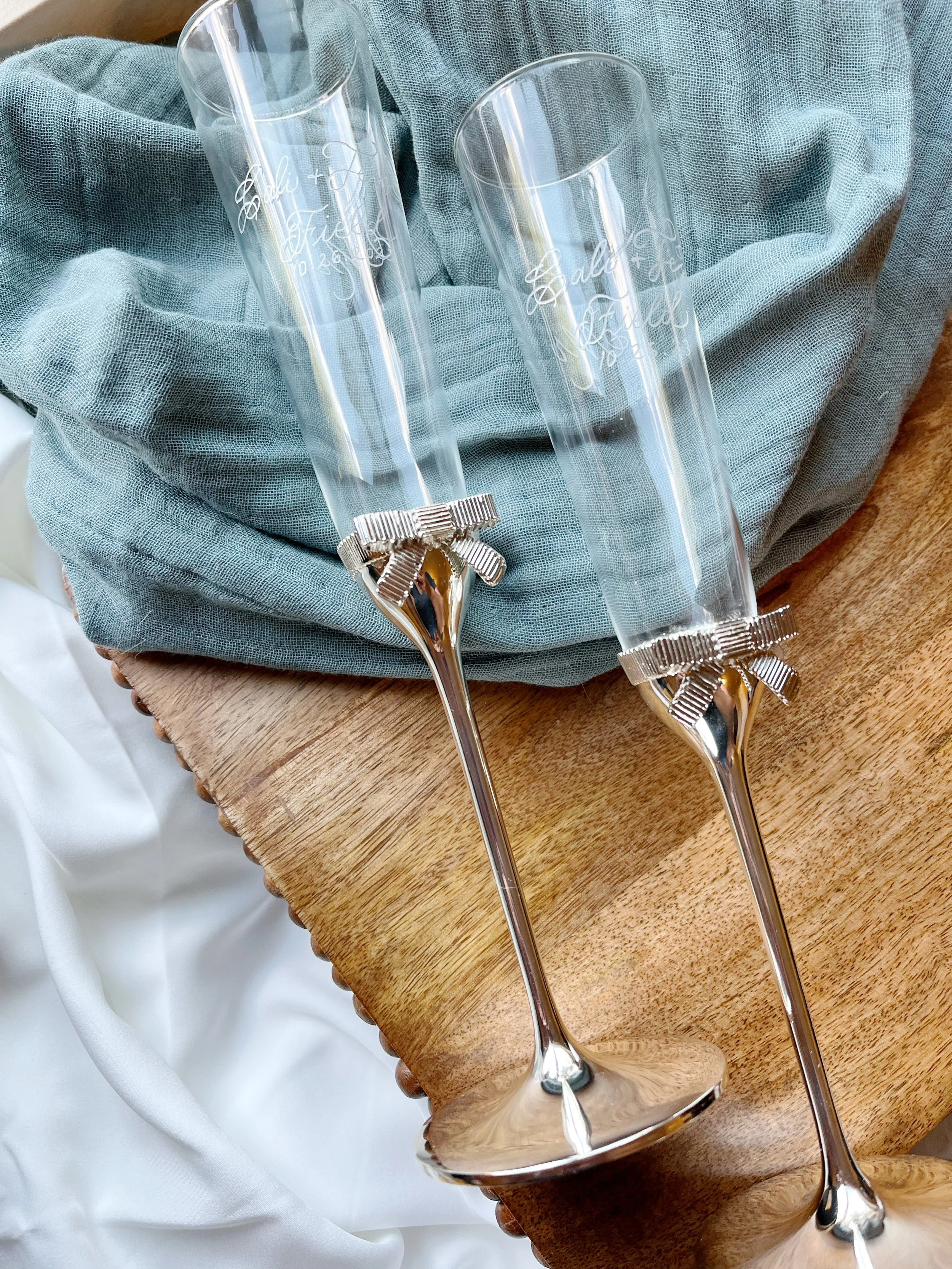 The key is keeping text concise. Champagne flutes offer limited engraving space, so shorter phrases work best while maintaining readability and elegance.