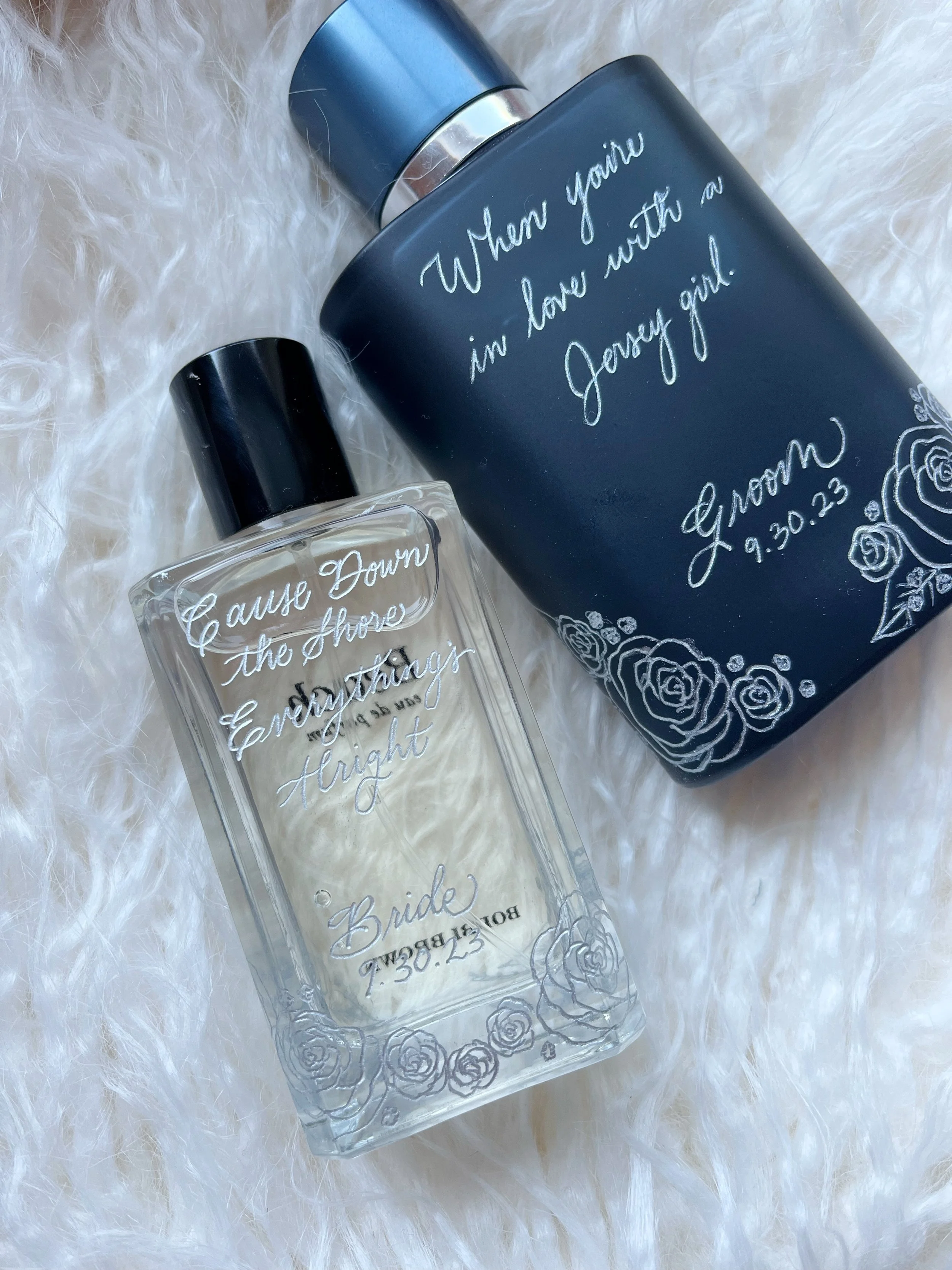 I recently completed a set that perfectly captures what this kind of gift can be. The bride's bottle, a delicate clear glass perfume, was engraved with the words: "Cause Down the Shore, Everything's Alright." The groom's dark cologne bottle carried the lyric: "When You're in Love with a Jersey Girl." Both bottles were adorned with hand-engraved roses, diamonds, and their wedding date — a design thread that tied the pair together even as each bottle stood beautifully on its own.